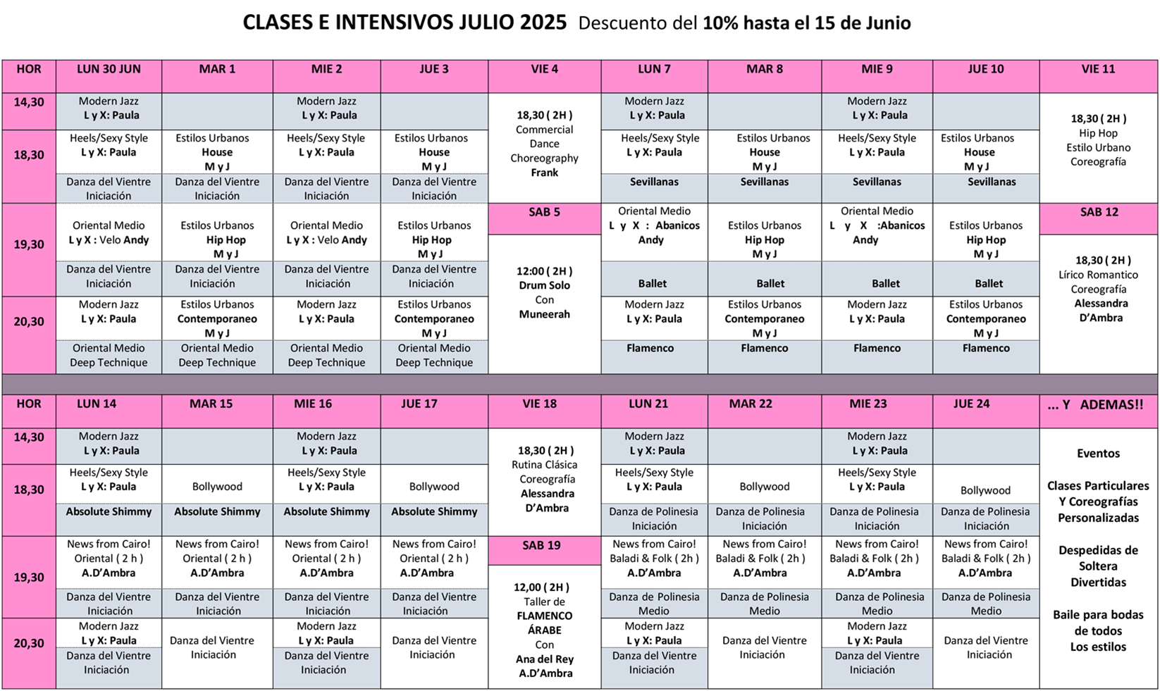 En la Escuela de Danza D’Ambra Dance Project tenemos un programa de baile durante todo el mes de Julio, además con un descuento del 10% hasta el 15 de Junio ¡Sigue las NOVEDADES EN EL IG de la escuela para no perderte ninguno de nuestros intensivos y talleres! Desde iniciación hasta niveles más avanzados, con una gran variedad de horarios y estilos de danza: Danza del Vientre, Modern – Jazz, Hip Hop y Estilos Urbanos, Ballet Adultos, Flamenco, Sevillanas, Absolute Shimmy, Danza de Polinesia y mucho más. Mira nuestras propuestas para seguir con tu aprendizaje y formación en formato PRESENCIAL, ONLINE Y EN DIFERIDO !!!!